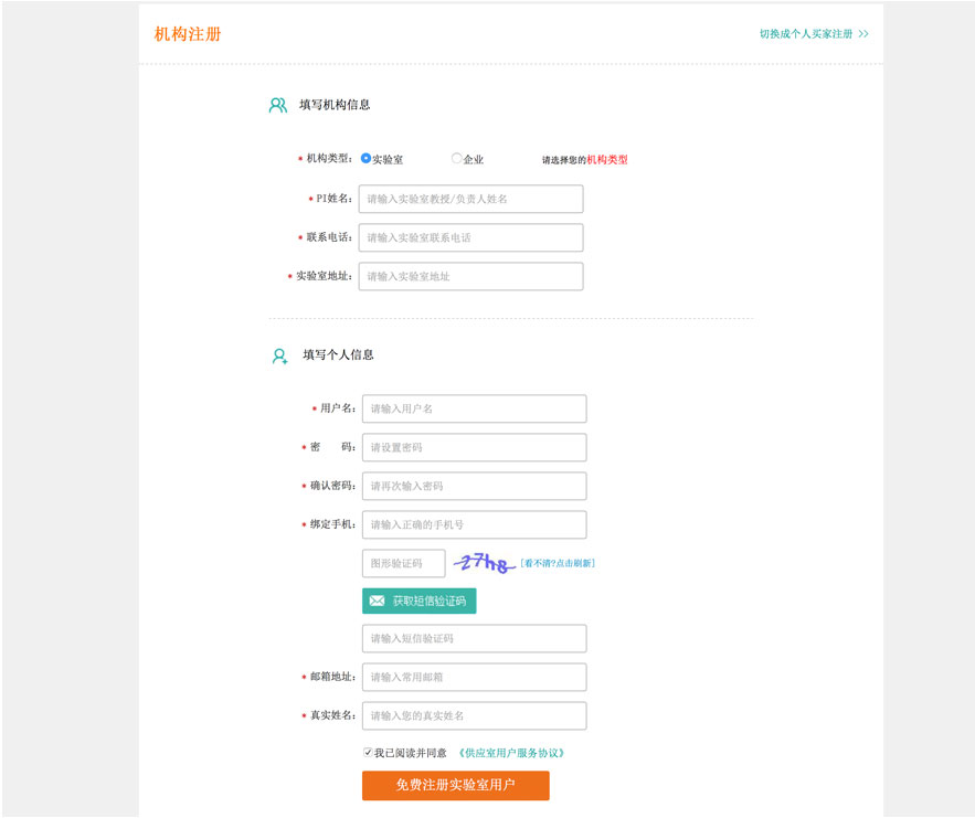 亲爱的供应室用户,首先请根据您的机构类型,选择“实验室”或“企业”,填写机构信息。若PI姓名/企业名称已注册可直接加入机构,通知 管理员批准加入。
