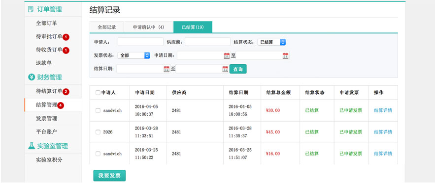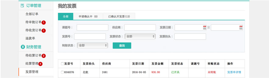 对于完成结算的订单,向商家要求发票,等待商家开票。收到发票后,核对发票信息,确认收取,进入财务的结帐流程。