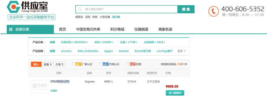 在搜索框内输入产品名称/货号/关键字,以搜索产品,选择您要购买的商品,点击“加入购物车”。可根据品牌、供应商、认证等筛选产品。
