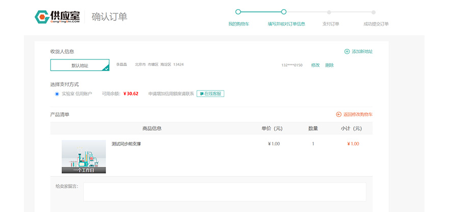 管理员核对订单金额,进行虚拟支付,完成下单,等待商家接受订单并送货。