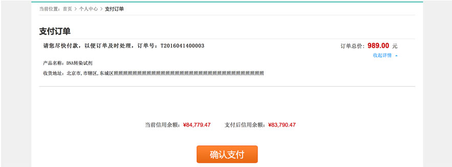 挑选商品后,核对产品名称、数量、金额等信息,点击“生成订单”进入确认下单页面, 填写收货人地址等信息。